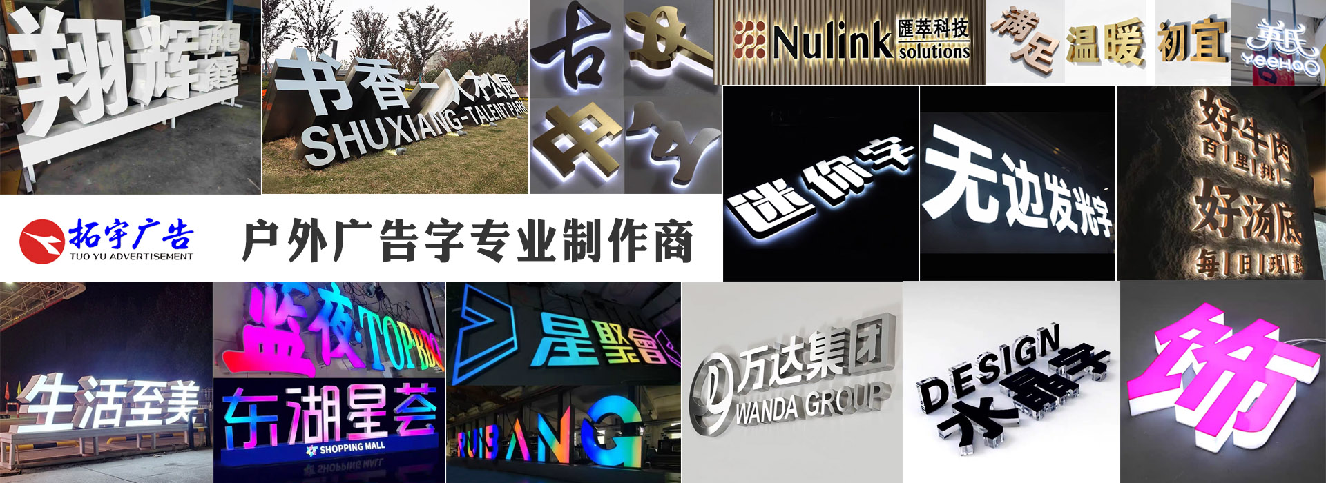 本公司是一家技术先进、实力雄厚,集广告设计、户外广告、楼顶广告、招牌、标牌、展览、展柜于一体的专业制作公司。致力于门头LED发光字、吸塑发光字、超薄灯箱、水晶灯箱、吸塑灯箱、水晶字、PVC字、标识标牌、户内外广告制作。是一家集设计、制作、安装,为一体的综合性广告公司。专业制作数码写真、喷绘、印刷彩业、海报、丝网印、条幅、锦旗、彩旗、绶带、衣服印字、礼品印字、字牌、制度牌、胸牌、标牌、广告牌、楼牌、铜牌、铝牌、门牌号、门头、灯箱、金卡、银卡、贵宾卡、会员卡、胸卡、展板、展架、易拉宝、钛金字、铁皮字、水晶字、发光字、LED霓虹灯、显示屏、吸塑、租售高空气球、拱门等。